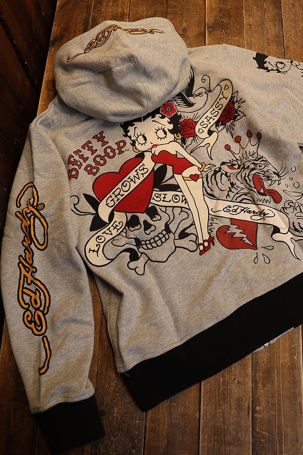 BETTY BOOP×ED HARDY BED-2502 ベティ×エドハーディー 刺繍 裏毛フルZipパーカー ミックスグレー