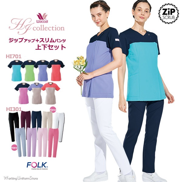 ワコールHIコレクションセット レディースジップスクラブ白衣HI701 スリムストレートパンツHI301ネオα