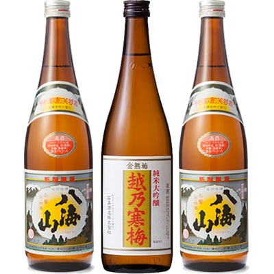 妙高 旨口四段 720ml と 越乃寒梅 金無垢 純米大吟醸 720mlと八海山 720ml