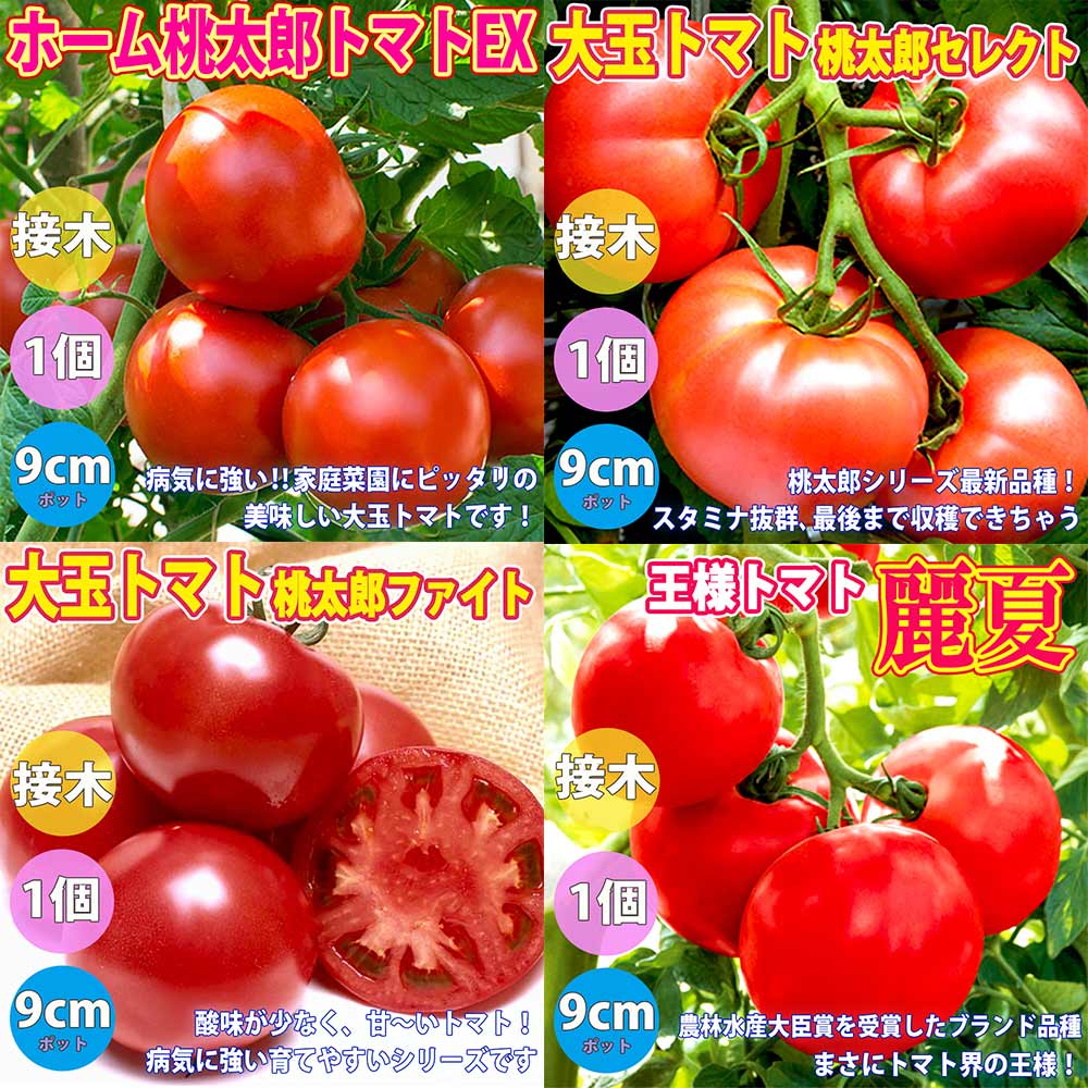 人気の接木苗 桃太郎トマト3品種&王様トマト各1個セット セット品種:ホーム桃太郎トマトEX・桃太郎セレクト・桃太郎ファイト・麗夏...