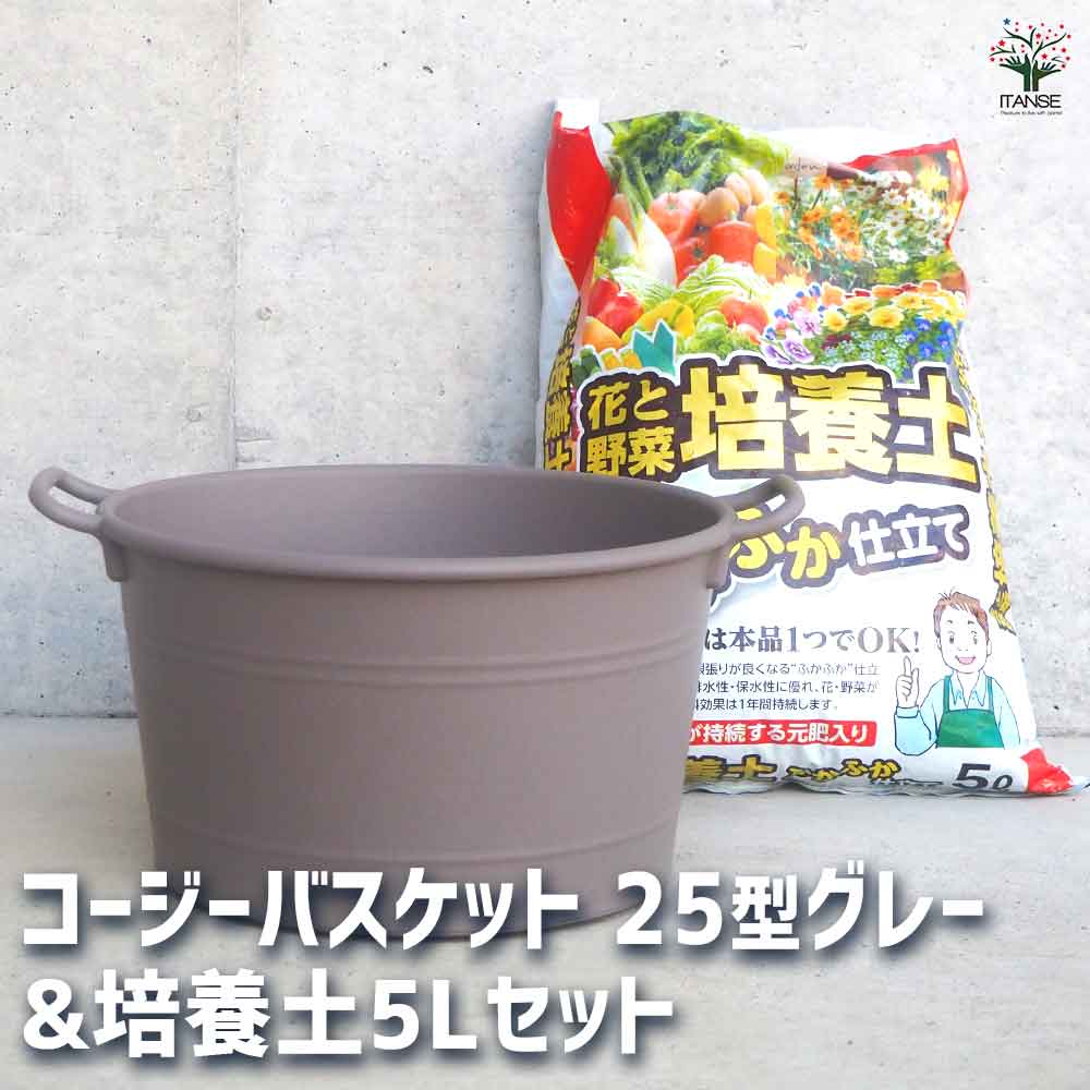コージーバスケット グレー 【資材 25型&花と野菜の培養土 ふかふか仕立て5L】