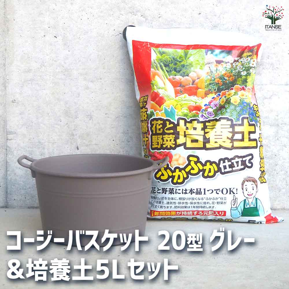 コージーバスケット グレー 【資材 20型&花と野菜の培養土 ふかふか仕立て5L】