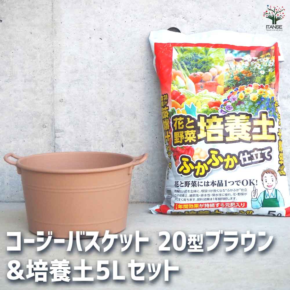 コージーバスケット ブラウン 【資材 20型&花と野菜の培養土 ふかふか仕立て5L】