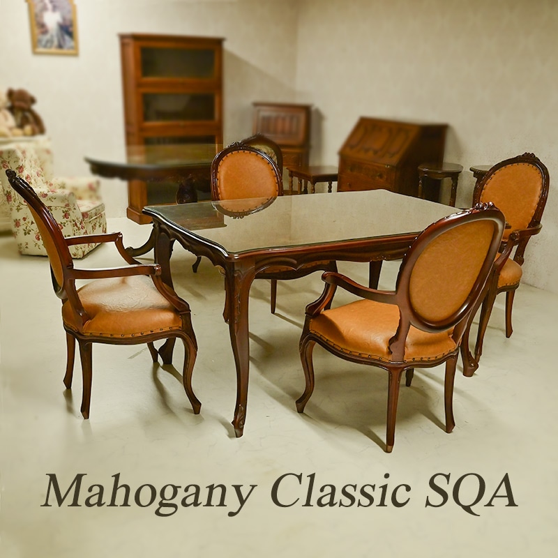 テーブル5点セット スクエア ダイニングテーブル+アームチェア4脚セット 食卓机+机椅子4脚セット 135cm花柄 マホガニー材使...
