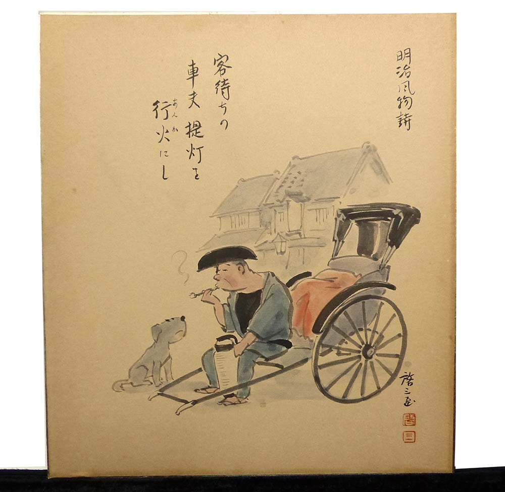 戦前 「島田啓三」明治風物詩 色紙 / 肉筆画 / 冒険ダン吉 人気漫画家(印・サインあり)【中古】