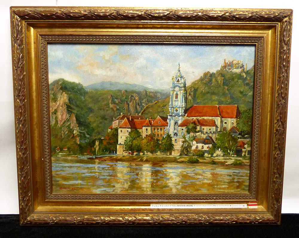 ストラウコウスキー作 デュルシタインのドナウ川と聖堂参事会修道院 / 油彩画 額装【中古】【送料無料】