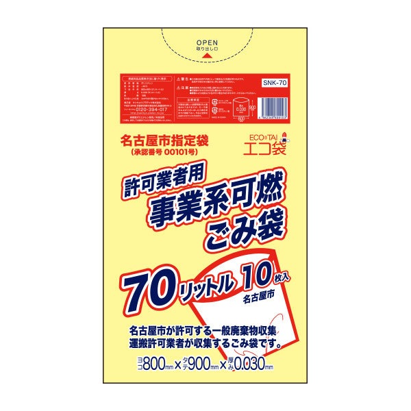 名古屋市事業系指定袋 可燃 70リットル 0.030mm厚 黄色(10枚x40冊)