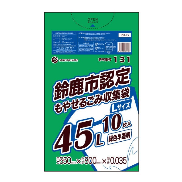 鈴鹿市指定袋 もやせるごみ用 45リットル 0.035mm厚 緑色半透明(10枚x60冊)