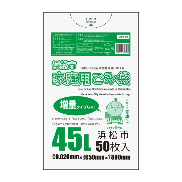 浜松市指定 家庭用ごみ袋 45リットル 65x80cm 0.020mm厚 半透明(50枚x18冊)