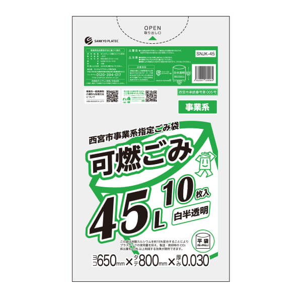 西宮市事業系指定ごみ袋 可燃ごみ 45リットル 0.030mm厚 白半透明(10枚x60冊)