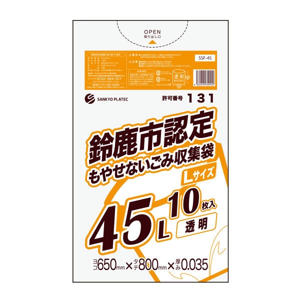 鈴鹿市指定袋 もやせないごみ用 45リットル 0.035mm厚 透明(10枚x60冊)