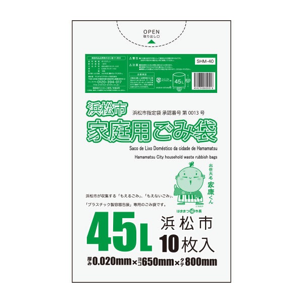 浜松市指定 家庭用ごみ袋 45リットル 半透明 65x80cm 0.030mm厚(10枚x60冊)