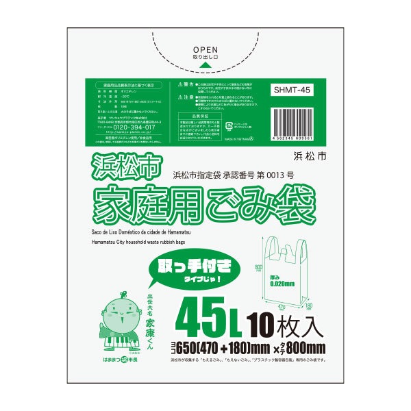 浜松市指定 家庭用ごみ袋 取手付き 45リットル 半透明 65(47+マチ18)x80cm 0.020mm厚(10枚x80冊)