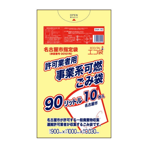 名古屋市事業系指定袋 可燃 90リットル 0.030mm厚 黄色(10枚x30冊)