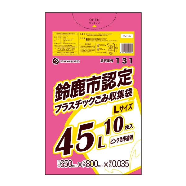 鈴鹿市指定袋 プラスチックごみ用 45リットル 0.035mm厚 ピンク色半透明(10枚x60冊)