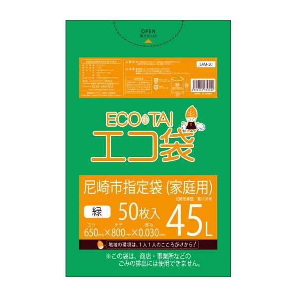 尼崎市指定袋 (家庭用) 45リットル 増量タイプ グリーン 65x80cm 0.030mm厚 (50枚x12冊)