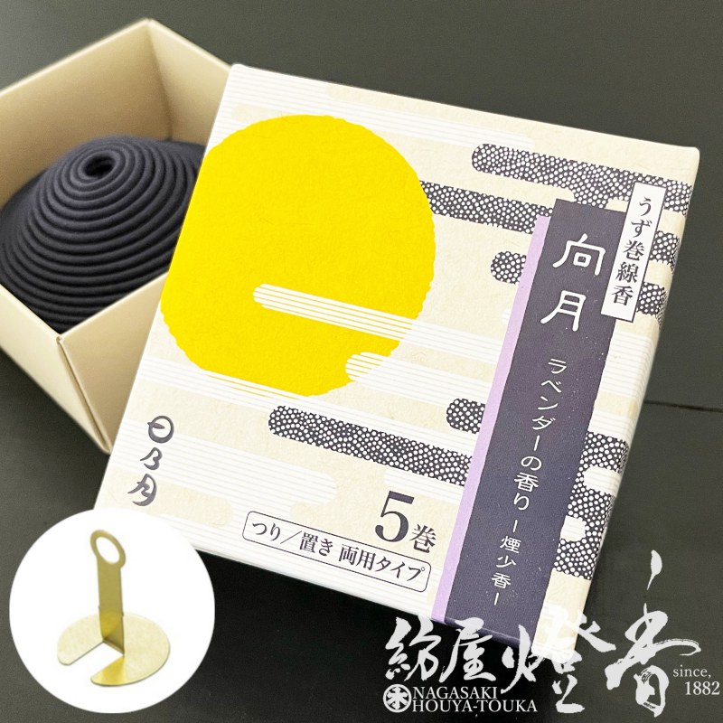 渦巻き線香『日乃月シリーズ【向月(こうげつ)-KOGETSU-・ラベンダー/5巻】紙箱[少煙/つり糸ナシ/専用金具付/燃焼12時間...