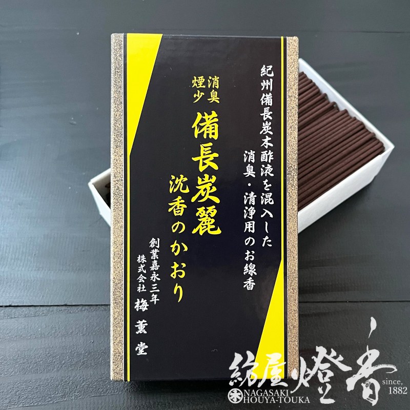 お線香『消臭・清浄用線香【備長炭麗-BINCHOTANREI-・沈香/50g】短寸金箔箱[少煙/消臭]』梅薫堂