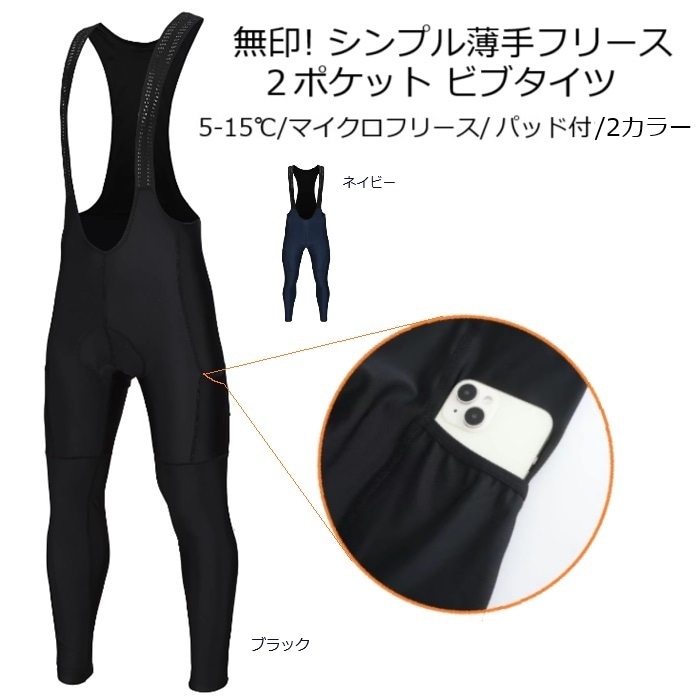 ビブタイツ『無印!シンプル薄手フリース2ポケットビブタイツ』パッド付 レーサーパンツ レーパン フリース ビブパンツ サイクルウェ...