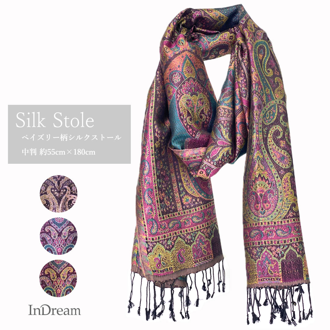 InDream ペイズリー柄 シルク ストール 中判[55cmx180cm]紫 古希祝い 春 秋冬 クリスマス ギフト おしゃれ...