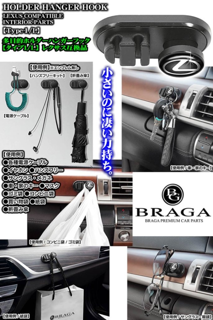 多目的ホルダーハンガーフック/レクサス互換品Lマークエンブレム付/客注品【タイプ1/L】ケーブル マスク 鍵 眼鏡 各袋 収納 整...