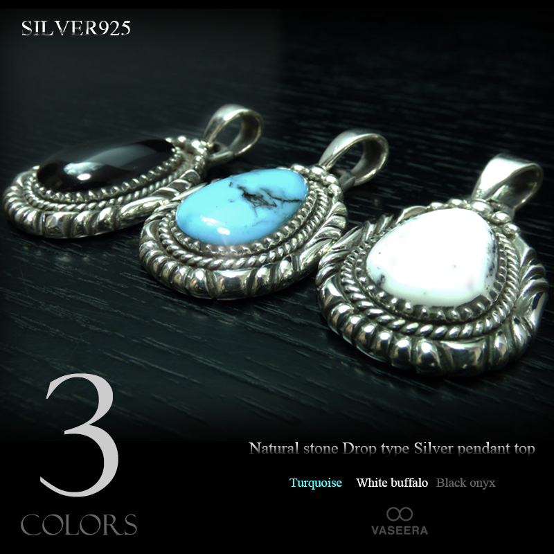 天然石3種(ターコイズ/オニキス/ホワイトバッファロー) ネイティブ系 ドロップ型 シルバー ペンダント トップ 【シルバー925...