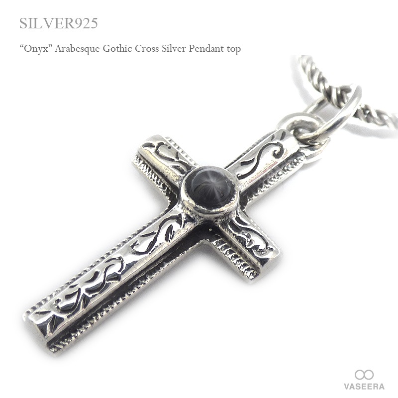 オニキス埋め込み 全長60mm 透かし彫りアラベスク(唐草) クロス シルバー ペンダント トップ 【シルバー925/SILVER...