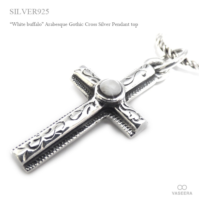 ホワイトバッファロー埋め込み 32mmアラベスク彫刻 ゴシック調クロス シルバー ペンダント トップ 【シルバー925/SILVE...