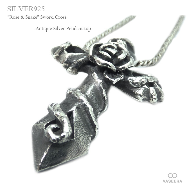 ローズ&スネーク(薔薇と蛇) 燻し仕上げ シルバー クロス ペンダント トップ 【シルバー925/SILVER925 /ペンダント...