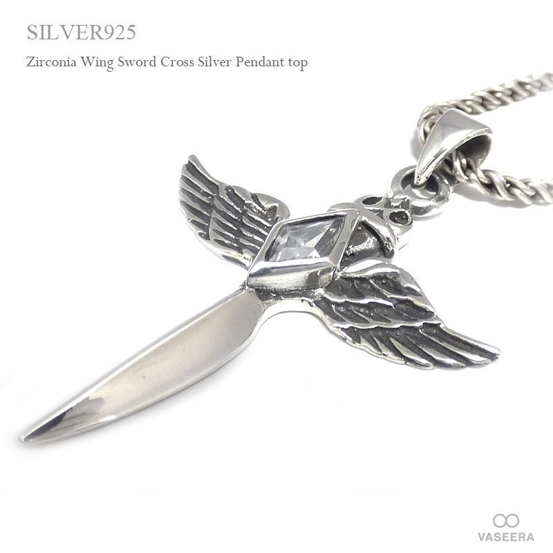 ジルコニア埋め込み ウィングソード(翼と剣) クロス シルバー ペンダント トップ 【シルバー925/SILVER925 /ペンダ...