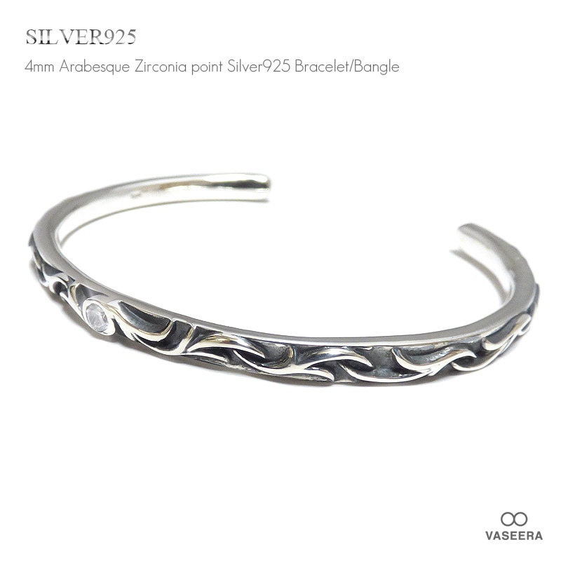 4mm幅 ジルコニア埋め込み 全面アラベスク(唐草)彫刻 シルバーバングル 【シルバー925/SILVER925 /ブレスレット】