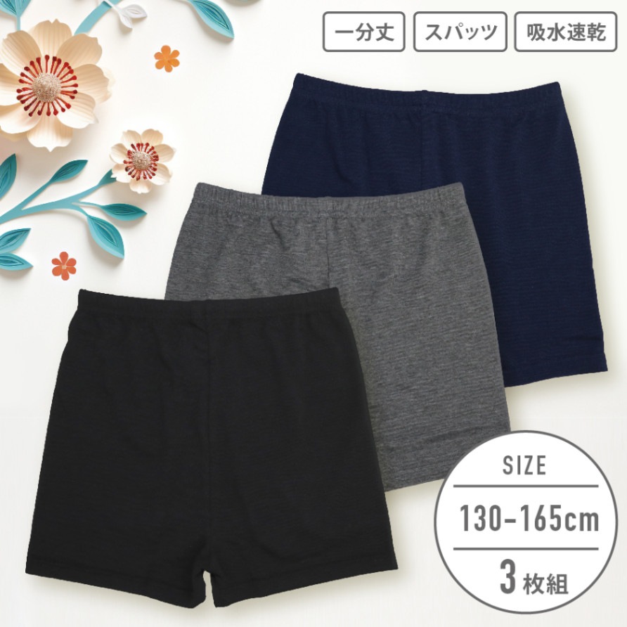 【女の子】ジュニア 一分丈オーバーパンツ 3枚組 黒/グレー杢/ネイビー 130~165cm【吸水速乾】