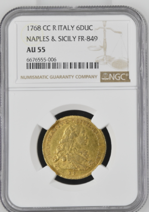 【レア度2-R2】1768年 イタリア ナポリ&シチリア王 フェルディナンド4世 6ドゥカティ金貨 NGC-AU55