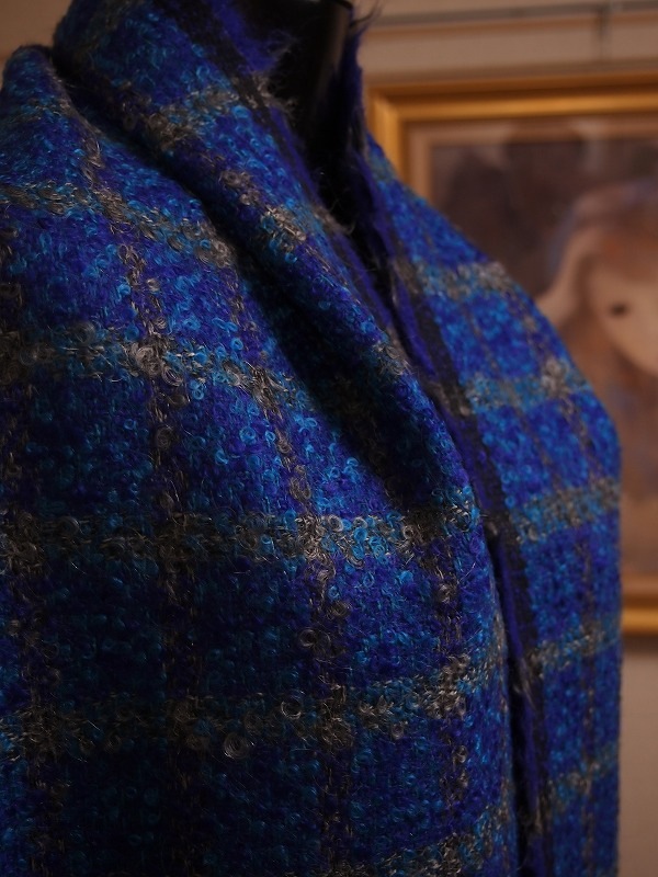 閉店大セール お買得 【モヘヤ リング織りチェック ツイード】 フランス製,輸入生地 ブルー/グレー モヘヤ44% ウール55%...