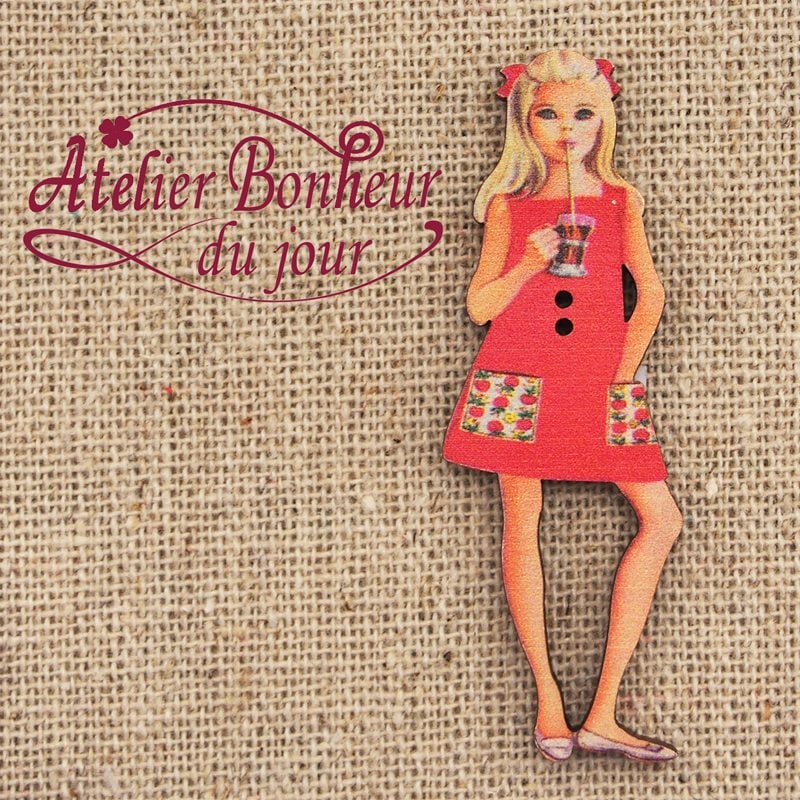 フランス製 木製ボタン 2つ穴 (赤いワンピースの女の子) アトリエ・ボヌール・ドゥ・ジュール