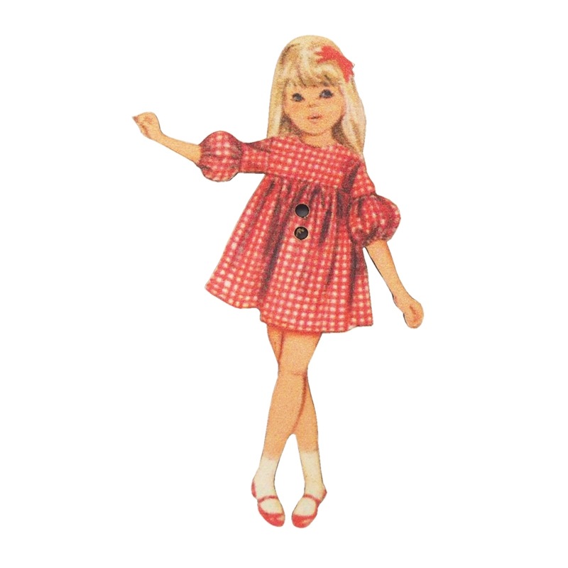 フランス製 木製ボタン 2つ穴 (赤いチェック柄ドレスの女の子) アトリエ・ボヌール・ドゥ・ジュール