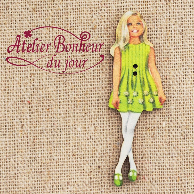 フランス製 木製ボタン 2つ穴 (グリーンのドレスの女の子) アトリエ・ボヌール・ドゥ・ジュール