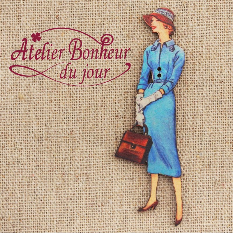 フランス製 木製ボタン 2つ穴 (青いワンピースの女性) アトリエ・ボヌール・ドゥ・ジュール