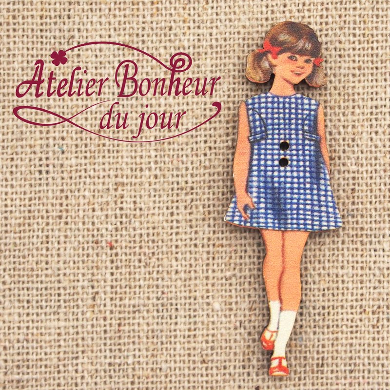 フランス製 木製ボタン 2つ穴 (青いチェックの女の子) アトリエ・ボヌール・ドゥ・ジュール