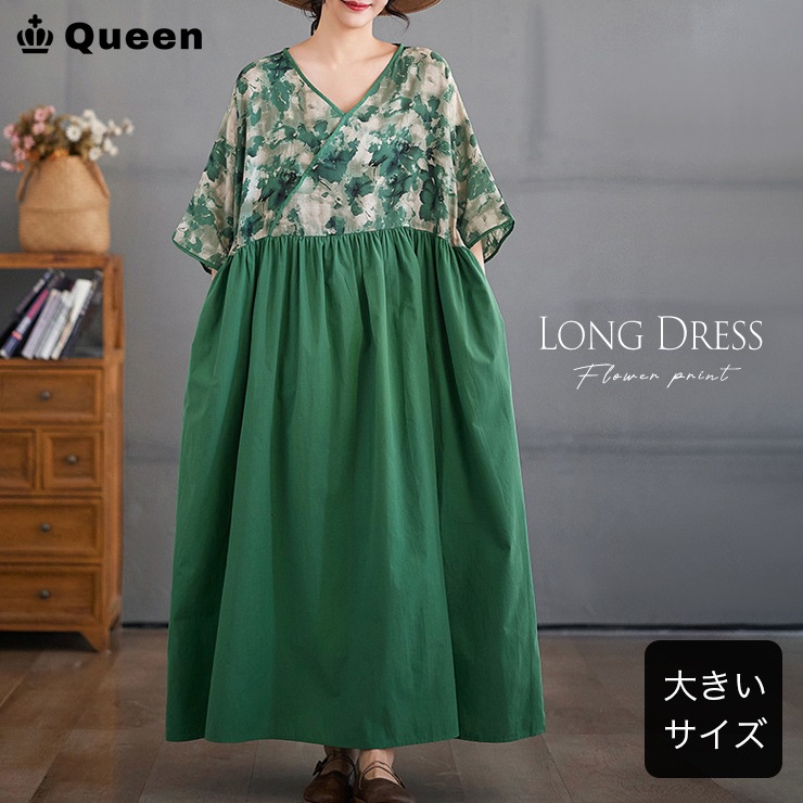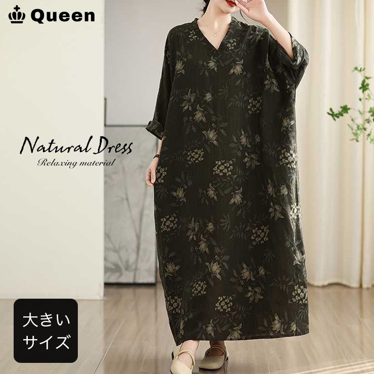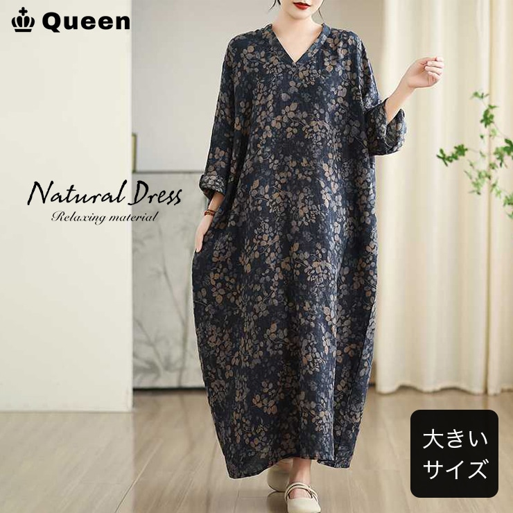 ワンピース 長袖 大きいサイズ レディース ワイドワンピ マキシ丈 総柄 リーフ 和風 プリント 薄手 春 夏 秋 (249732...