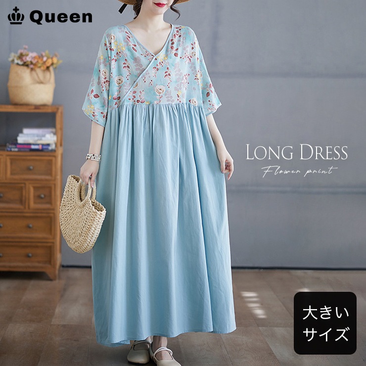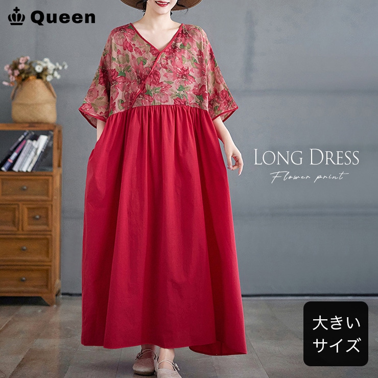 大きいサイズ レディース ワンピース 花柄ワンピ 半袖 Vネック 切り替えワンピ カシュクール 夏 50代 40代 (249719...