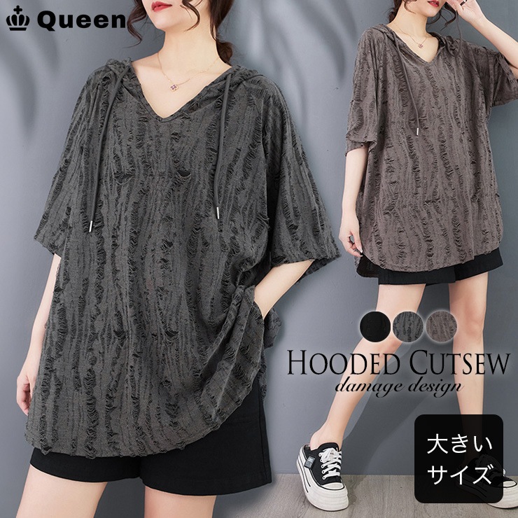 大きいサイズ レディース Tシャツ ダメージ加工 半袖パーカー トップス フーディー 夏 (11711)