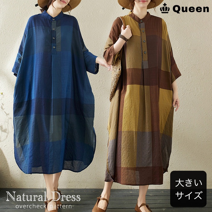 大きいサイズ レディース シャツワンピ チェック柄ワンピース 長袖 ロング丈 春 夏 秋 (206365)