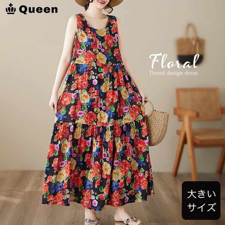 ビビットフラワーノースリーブティアードワンピース (388026)