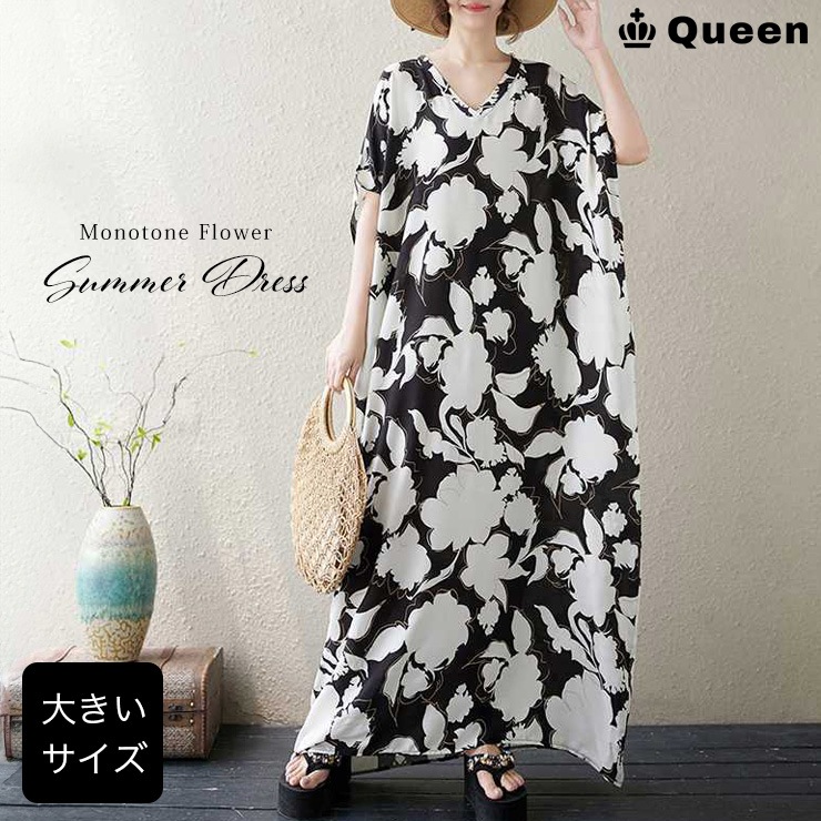 大きいサイズ レディース マキシワンピース モノトーン 黒ワンピ Vネック 刺繍 夏 (1245570)