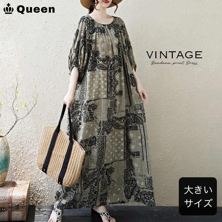 ワンピース 長袖 大きいサイズ レディース ワイドワンピ マキシ丈 総柄 アンティーク レトロ 薄手 春 夏 秋 (249733)