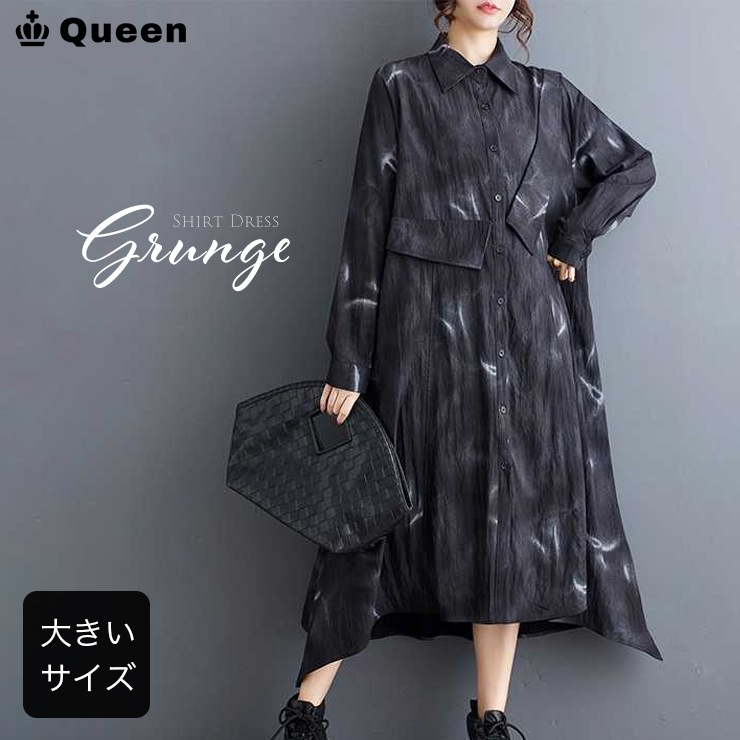 大きいサイズ レディース シャツワンピース 長袖 イレギュラーヘム アシメワンピ ぼかし柄 秋 春 (435118)