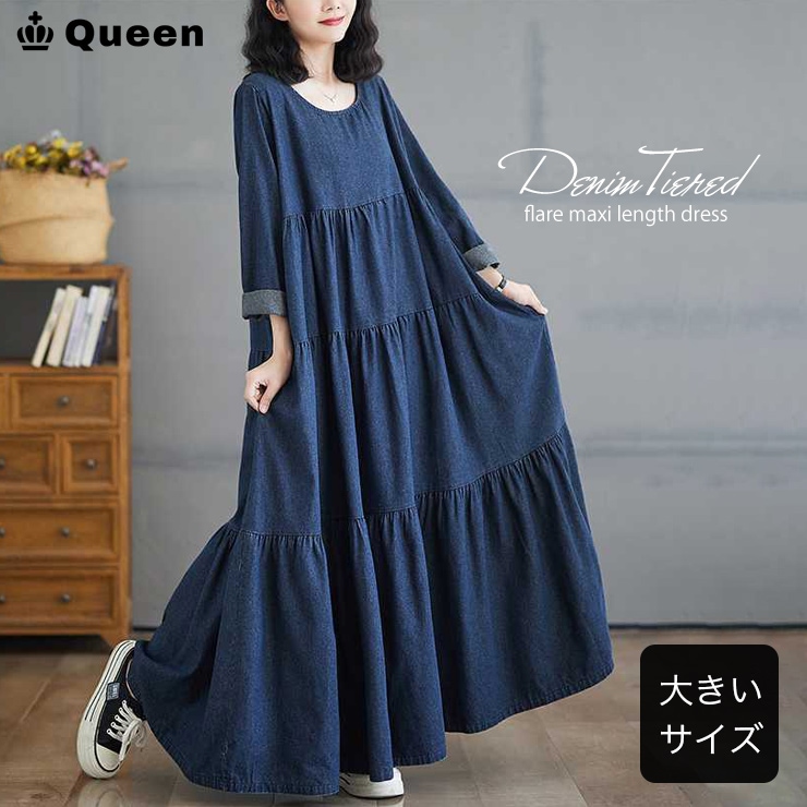 大きいサイズ レディース デニムワンピース ティアードワンピ マキシ丈 フレア 長袖 秋 春 (135571)