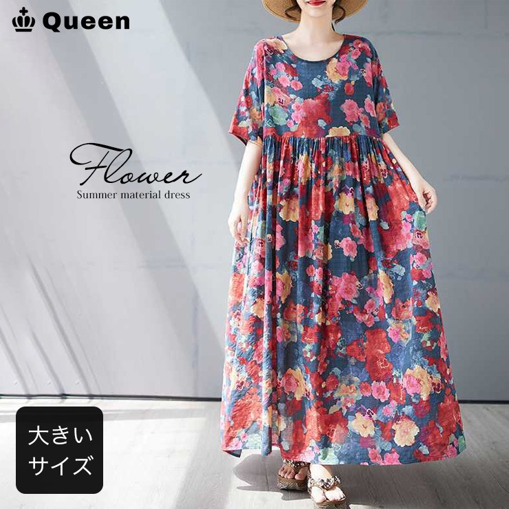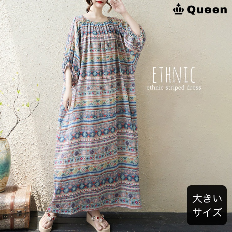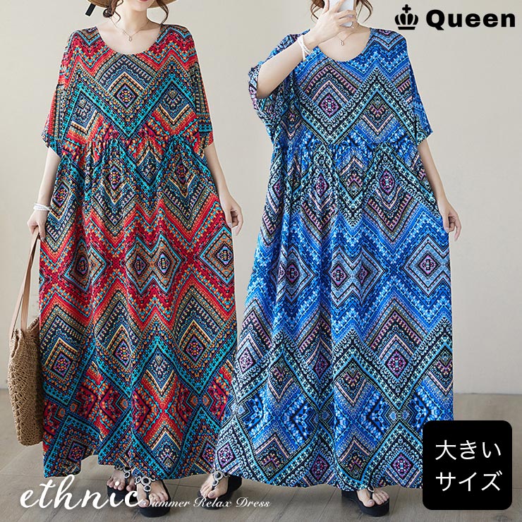 大きいサイズ レディース 総柄ワンピース ワイドワンピ マキシ丈 半袖 エスニック柄 サマーワンピ 夏 (16806)