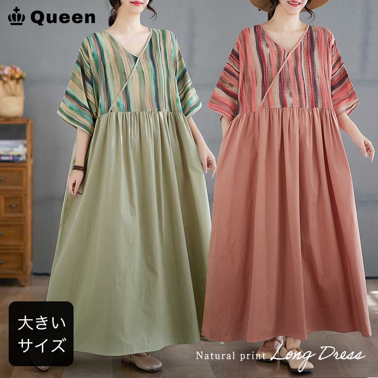 ワンピース 長袖 大きいサイズ レディース ワイドワンピ マキシ丈 総柄 和風 ボヘミアン 薄手 春 夏 秋 (249740)